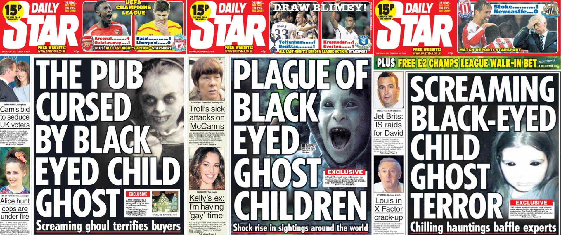 The UK tabloid The Daily Star carried sensationalised headlines about back-eyed children three times over the period of a week during October 2014. The stories featured claims that multiple sightings of beings resembling black-eyed children had been made around Cannock Chase, an area of protected countryside close to Birmingham in the West Midlands.