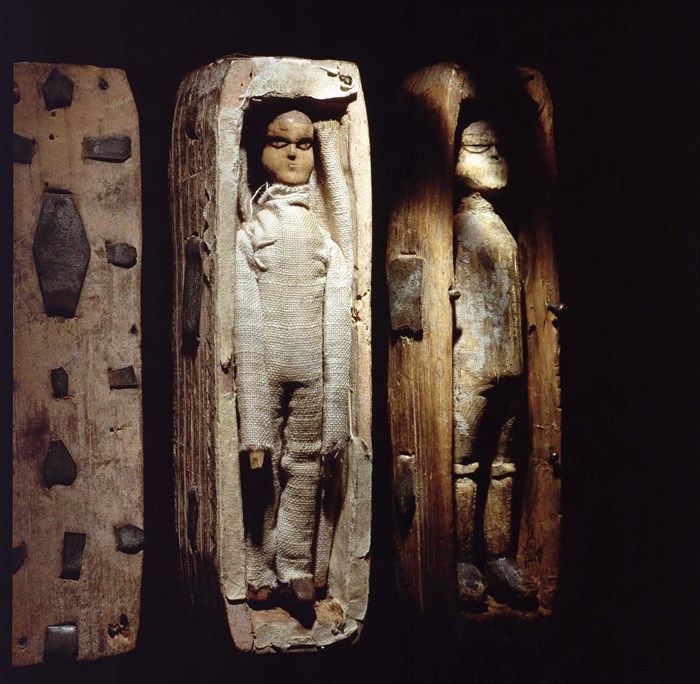 The coffins had been carefully arranged in two neat rows of eight, with the 17th placed at the start of a new row. Around 10cm in length, each contained a small figure that Was clearly carved by someone with significant skill, dressed in various cloth outfits.