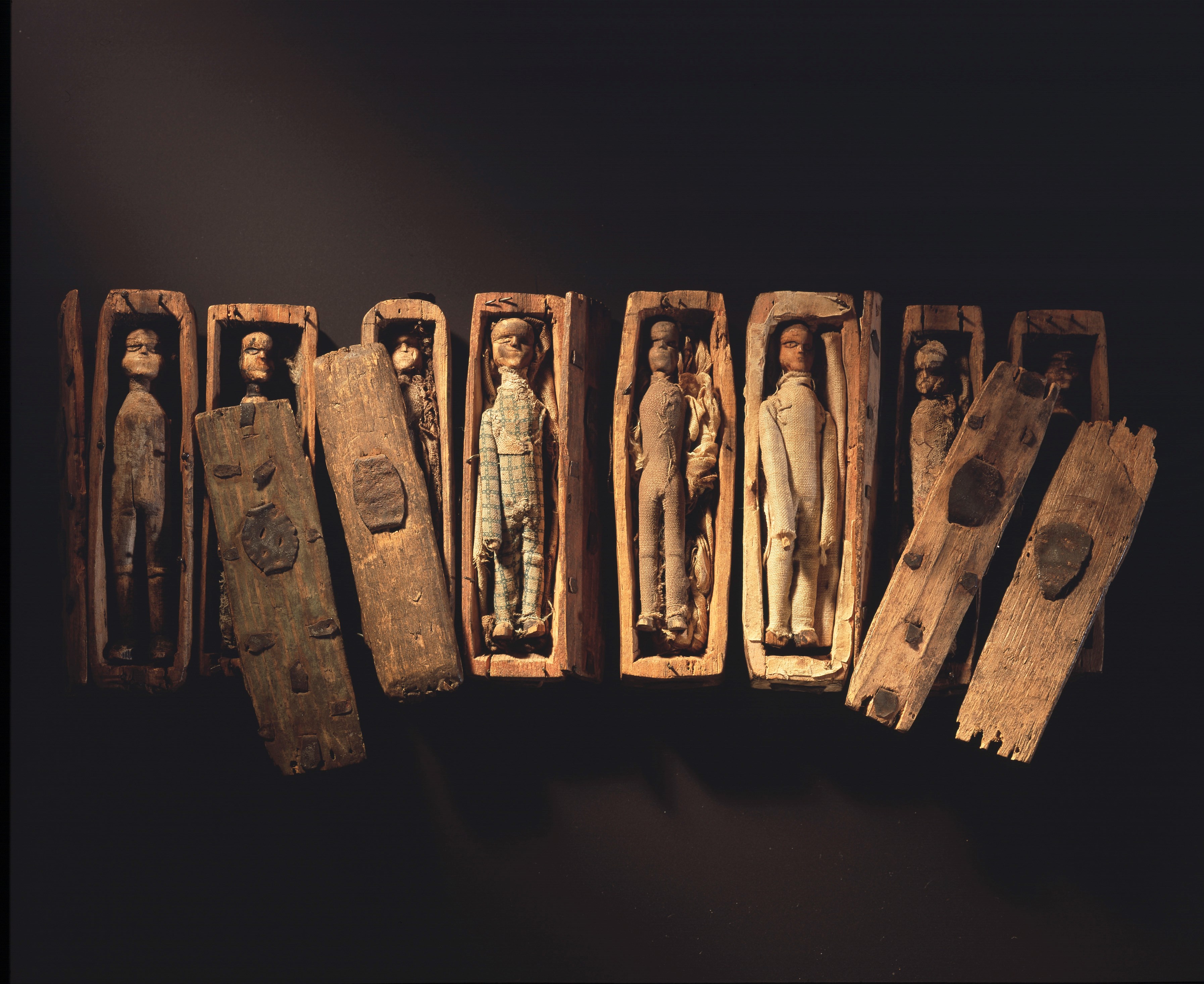 The Scotsman newspaper at the time reported that a number of the coffins were destroyed by the boys after being discovered, but some survived and eventually found their way into the hands of private collectors. Eight of them were donated to the Scottish Society of Antiquaries in 1902 and are the only ones that remain accounted for. Variances in the deterioration of the figures may suggest that they were not all placed at once, rather the collection was assembled and added to over time.