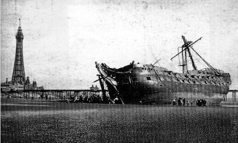 Three years later, HMS Foudroyant, the former flagship of Admiral Nelson, was raising funds for a restoration project after an illustrious career by traveling to a number of UK seaside resorts. Caught in a storm off Blackpool, the 80-gun, 56 metre former Ship-of-the-Line was wrecked close to North Pier. Unable to be refloated, the wreckage was used to make furniture fittings, including the wood paneling of the former Blackpool FC boardroom at Bloomfield Road.